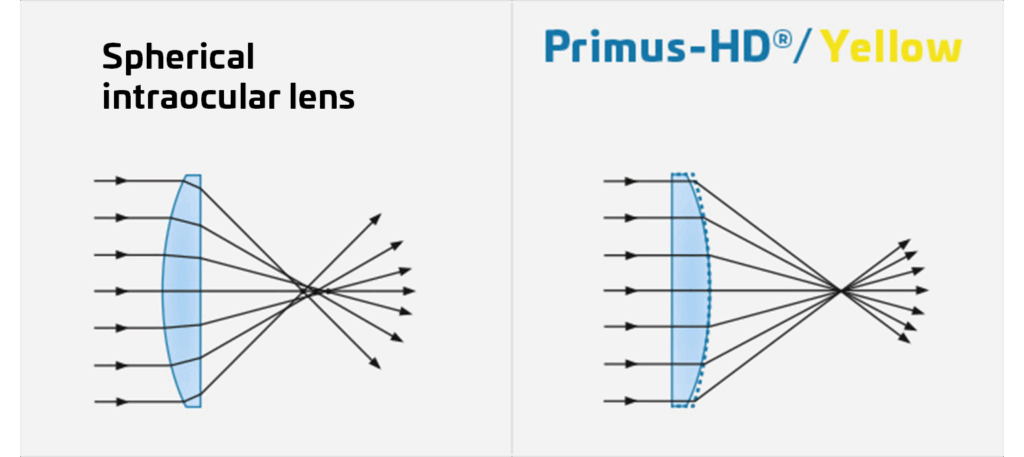 For many years, so-called spherical standard intraocular lenses have been used in cataract surgery. Numerous manufacturers offer these lenses in many different variants. However, spherical lenses have the disadvantage of causing certain optical errors that affect the quality of vision. The aspherical Primus-HD® intraocular lenses can avoid these optical errors. This improves the overall quality of vision, particularly contrast vision and vision in the dark.