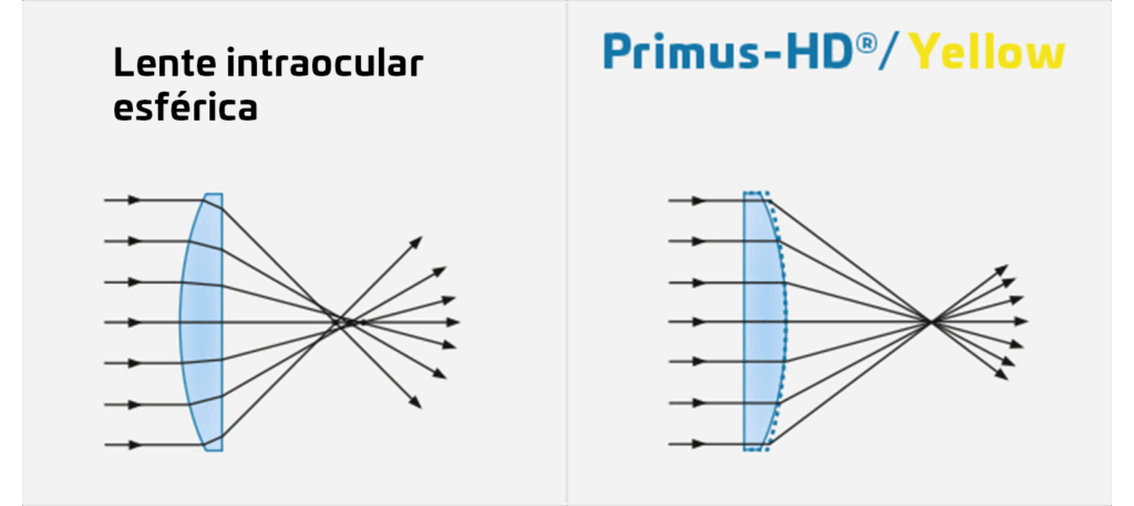 Una lente esférica no enfoca los rayos de luz que inciden de forma periférica en el mismo punto que los rayos que inciden de forma central. Esto se debe a que el poder de refracción de la lente aumenta a medida que el rayo de luz incide más lejos del centro de la misma. Los rayos de luz periféricos incidentes se refractan entonces más fuertemente a través de la lente que la luz incidente central. De este modo, la aberración esférica causa borrosidad en las imágenes con haz de rayos muy abierto, es decir, con pupila muy dilatada, lo cual causa una visión borrosa. Este defecto se puede eliminar fabricando las superficies de las lentes con menor curvatura hacia el borde. Precisamente esto es lo que ofrecen las ópticas correctoras de aberración de las lentes intraoculares Primus-HD®.