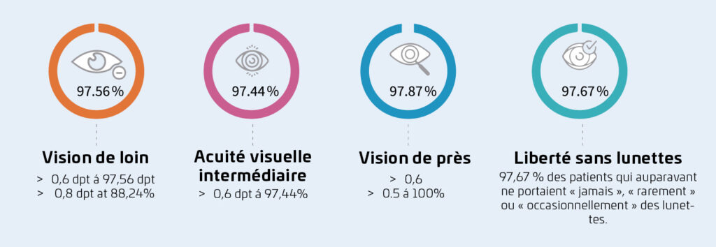 Les patients équipés de Max Vision™ obtiennent une meilleure acuité visuelle intermédiaire et une vision progressive, avec nettement moins d’éblouissements et un meilleur contraste par rapport aux produits concurrents.