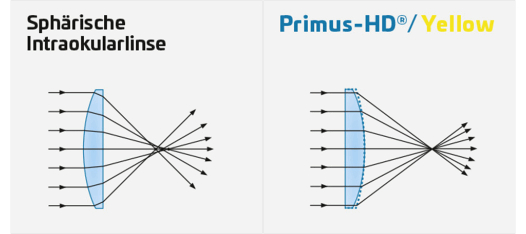 Eine sphärische Linse bündelt peripher einfallende Lichtstrahlen nicht am gleichen Punkt wie zentral einfallendes Licht. Grund dafür ist die Zunahme des Linsenbrechwertes mit zunehmendem Abstand des einfallenden Lichtstrahles vom Mittelpunkt der Linse. Peripher einfallende Lichtstrahlen werden dann stärker durch die Linse gebrochen als zentral einfallendes Licht. Somit verursacht die sphärische Aberration bei Abbildungen mit weit geöffnetem Strahlenbündel, also bei weit geöffneter Pupille Bildunschärfen. Dadurch wird das Sehen unscharf. Beseitigt werden kann dieser Fehler, indem die Linsenflächen zum Rand hin weniger stark gekrümmt hergestellt werden. Genau dieses, bieten die Aberrationskorrigierenden Optiken der Primus-HD Toric® Intraokularlinsen.